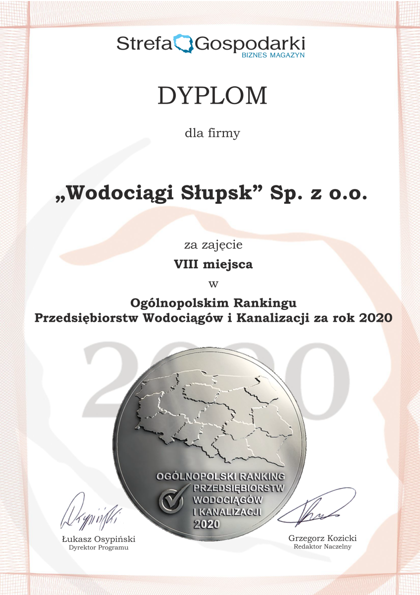 8. miejsce naszej Spółki w Ogólnopolskim Rankingu Przedsiębiorstw Wodociągów i Kanalizacji za rok 2020!