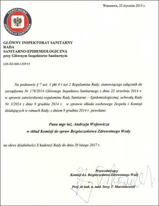 22 stycznia Prezes Zarządu „Wodociągów Słupsk” sp. z o.o. po raz pierwszy uczestniczył w posiedzeniu Komisji ds. Bezpieczeństwa Zdrowotnego Wody. Wtedy też odebrał nominację na członka tej komisji.