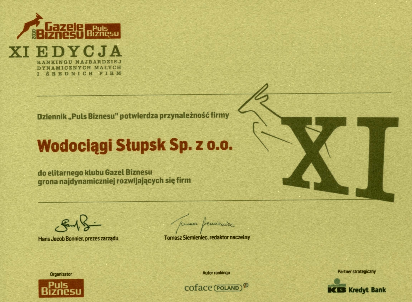 Mamy przyjemność poinformować, że „Wodociągi Słupsk” Sp. z o.o. znalazły się w gronie laureatów XI edycji Rankingu Najbardziej Dynamicznych Małych i Średnich firm GAZELE BIZNESU 2010, organizowanego przez gazetę „Puls Biznesu”.